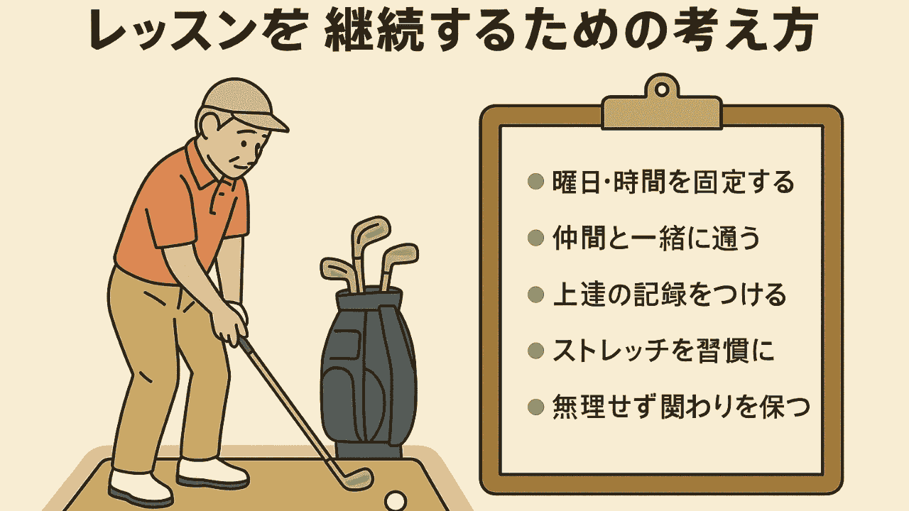 特にシニアでゴルフのレッスンを受ける場合、身体の変化や生活のリズムに合わせた“無理のない継続”が鍵となります。